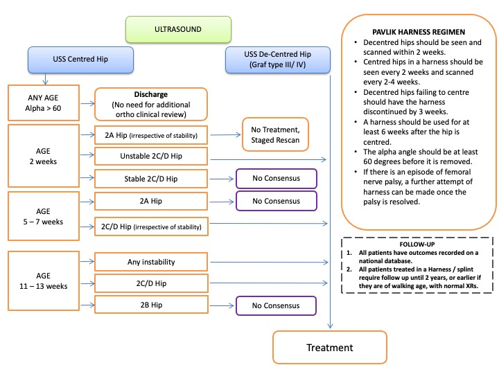 In undertaking the ultrasound, there was no consensus on whether a Graf cradle and probe holder should be mandatory, nor whether the core minimum criteria to be assessed and documented should include beta angle and description of femoral head coverage in terms of percentage. Regarding treatment, there was no consensus on whether a period of weaning from the harness / splint is required.